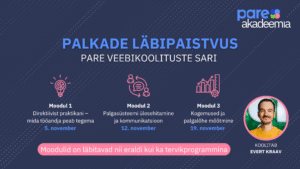 Et aidata organisatsioonidel sõltumata suurusest õigel ajal valmistuda, pakub PARE Akadeemia koostöös Bolti tasustamise juhi Evert Kraaviga kolmeosalist veebikoolituste sarja. Koolitused annavad vajalikud teadmised ja tööriistad, et luua läbipaistev ning konkurentsivõimeline tasusüsteem, mis toetab nii töötajaid kui ka organisatsiooni arengut.