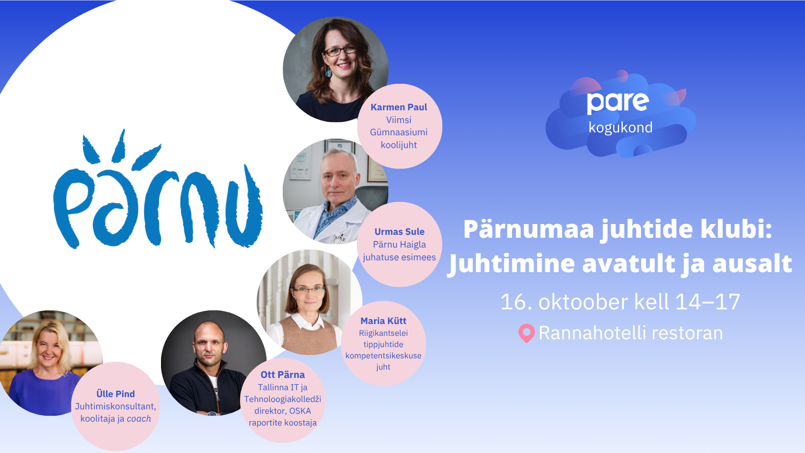 16. oktoobril toimub juhtide klubi “Juhtimine avatult ja ausalt”, kus räägime, mida need muutused tähendavad just Pärnumaa juhtidele ja kuidas luua juhtimiskultuur, mis on valmis homseks.