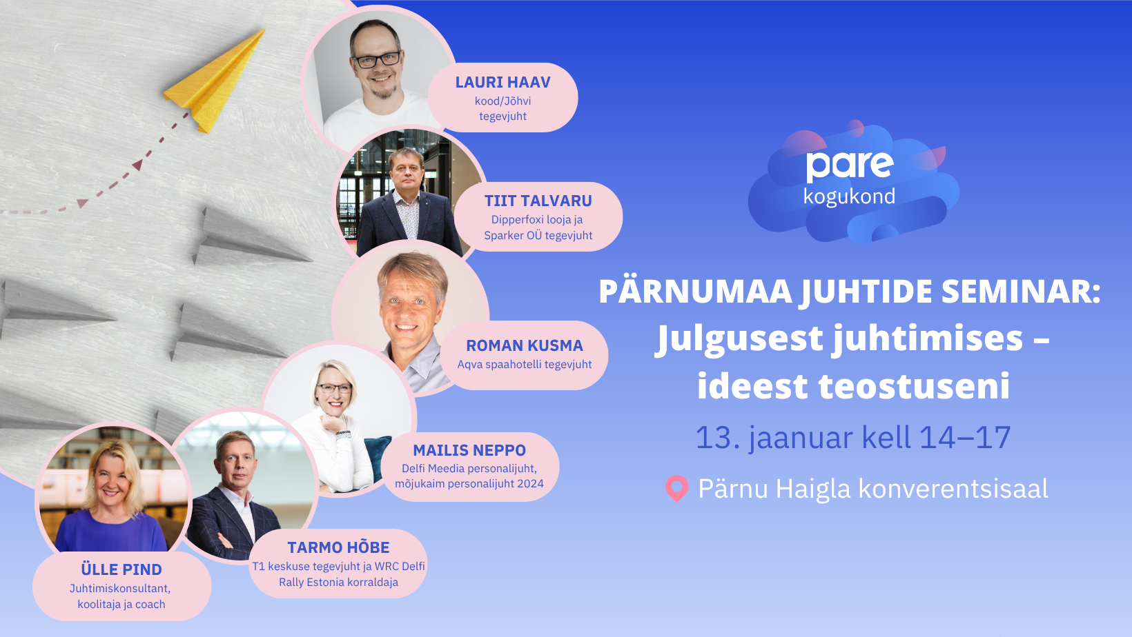 13. jaanuaril 2026 toimub juba teine Pärnumaa juhtide seminar, mis eelmisel korral osutus väga populaarseks ja tõi kokku juhid üle terve maakonna, et arutada avatud ja ausa juhtimise teemasid. Seekord võtame fookusesse julguse – selle erinevad tahud ja rolli nii strateegilises kui ka inimlikus juhtimises.