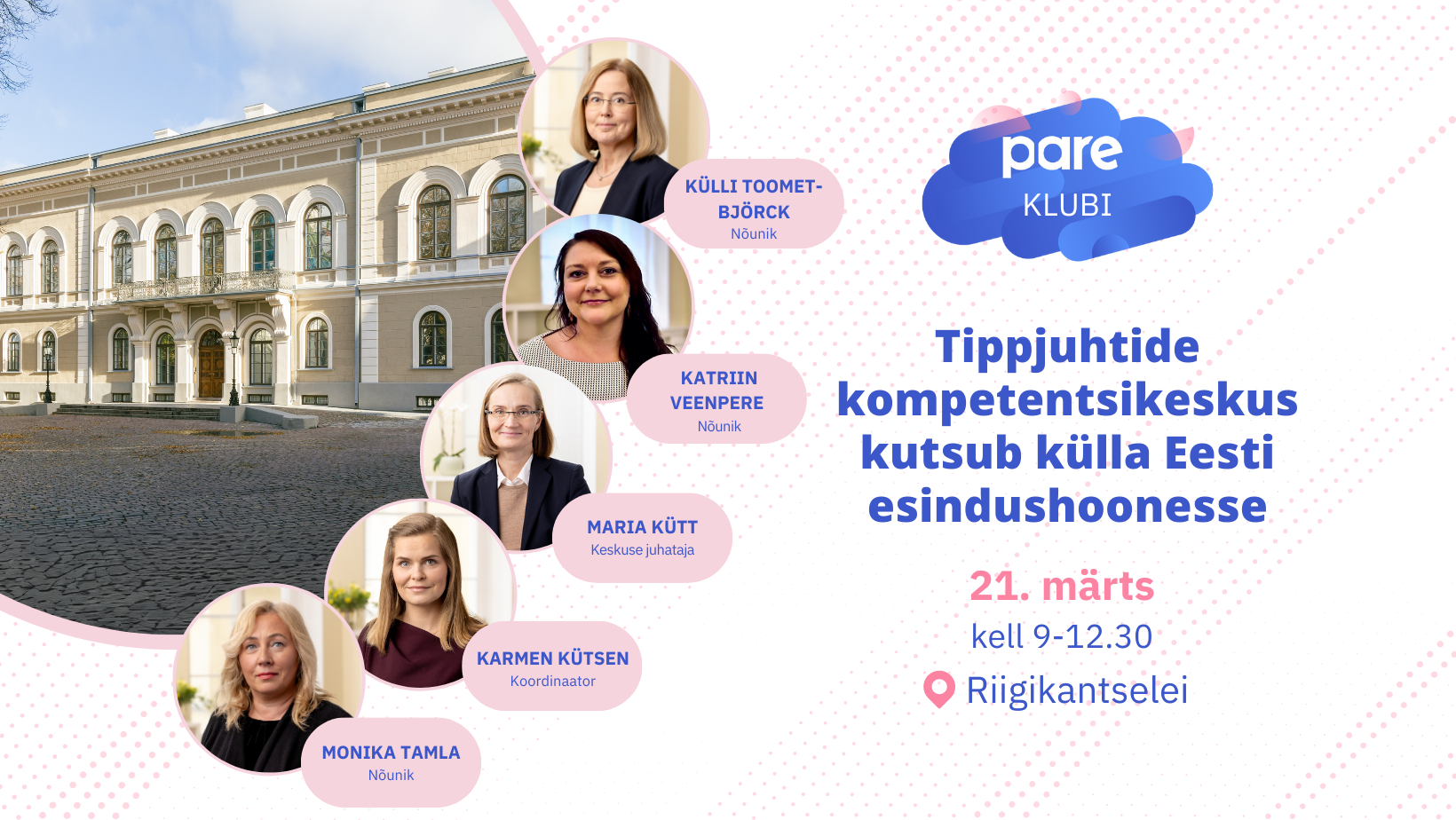 Tule ja saa teada, kuidas toimub Eesti avaliku teenistuse tippjuhtide arendamine ja järelkasvu tagamine. Neid teemasid avab Riigikantselei Tippjuhtide kompetentsikeskuse tragi naiskond eesotsas Maria Kütiga. Maria on ühtlasi PARE juhatuse aseesimees. Boonusena avaneb võimalus avastada Eesti esindushoonet.