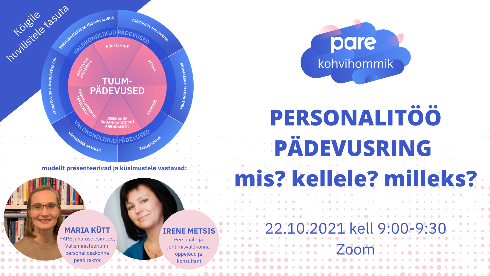 Pädevusring on mõeldud kõigile personalivaldkonna inimestele, mistõttu on kohvihommik sel korral avatud kõigile huvilistele, olenemata sellest, kas oled PARE liige või mitte. Kohtumine toimub virtuaalselt (Zoomis) ning registreerimise järel saadetakse e-posti teel kohtumise link koos täiendava informatsiooniga.