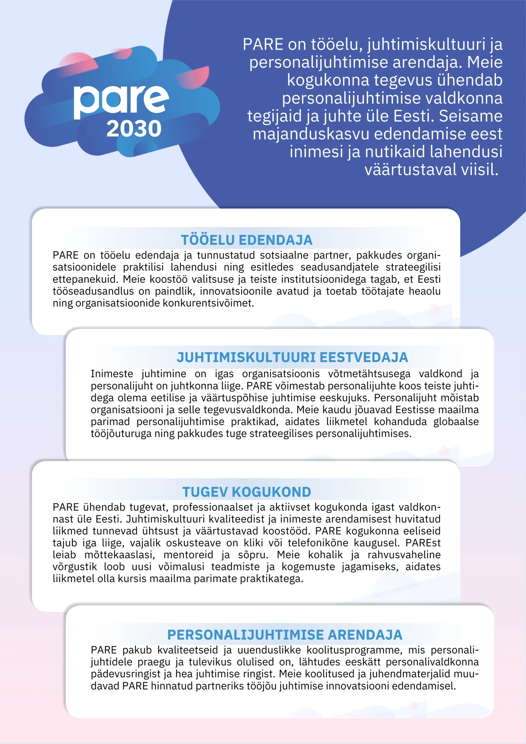 PARE on personalijuhtide ja -töötajate toetav kogukond, kust saad vajaliku niidiotsa inimeste juhtimise kvaliteedi arendamiseks. Oleme personali- ja inimeste juhtimise valdkonna professionaalide suurim võrgustik Eestis.