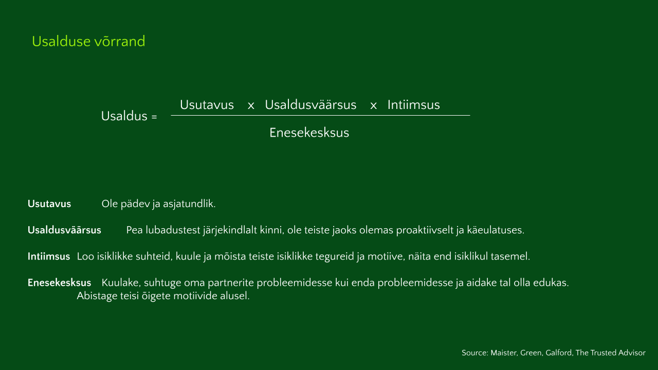 Usaldus kas on või ei ole. Osad inimesed ütlevad, et usaldus tuleb välja teenida. Teine osa inimesi ütleb, et usaldus on vaikimisi olemas kuni sa seda rikud. Kui usalduse tähendus laendada võrrandina, siis sisaldab see usutavust, usaldusväärsust ja intiimsust ning enesekesksust.