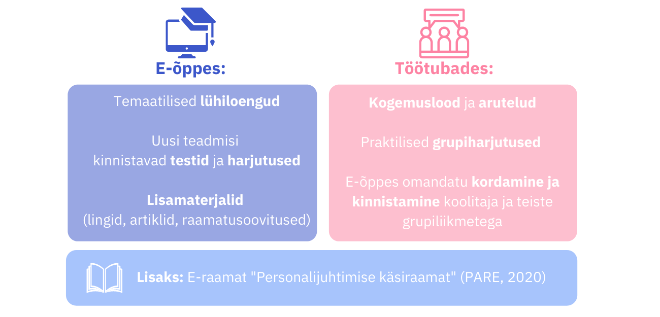Ka meie arenguprogrammid on lähtuvalt neist (ja mitmest teisest põhjusest, mida ka peagi teiega jagame;)), saanud uue vormi. Ehitame programmi moodulid üles e-õpet ja grupikohtumisi kombineerides. E-õppesse on mikroõppe printsiibil loodud lühivideod, lugemismaterjalid ja individuaalsed- ning grupiülesanded, et teha õppe sisu lihtsasti läbitavaks ja hoomatavaks. Siin näiteks PARE personalitöö baasoskuste arenguprogrammi metoodika: