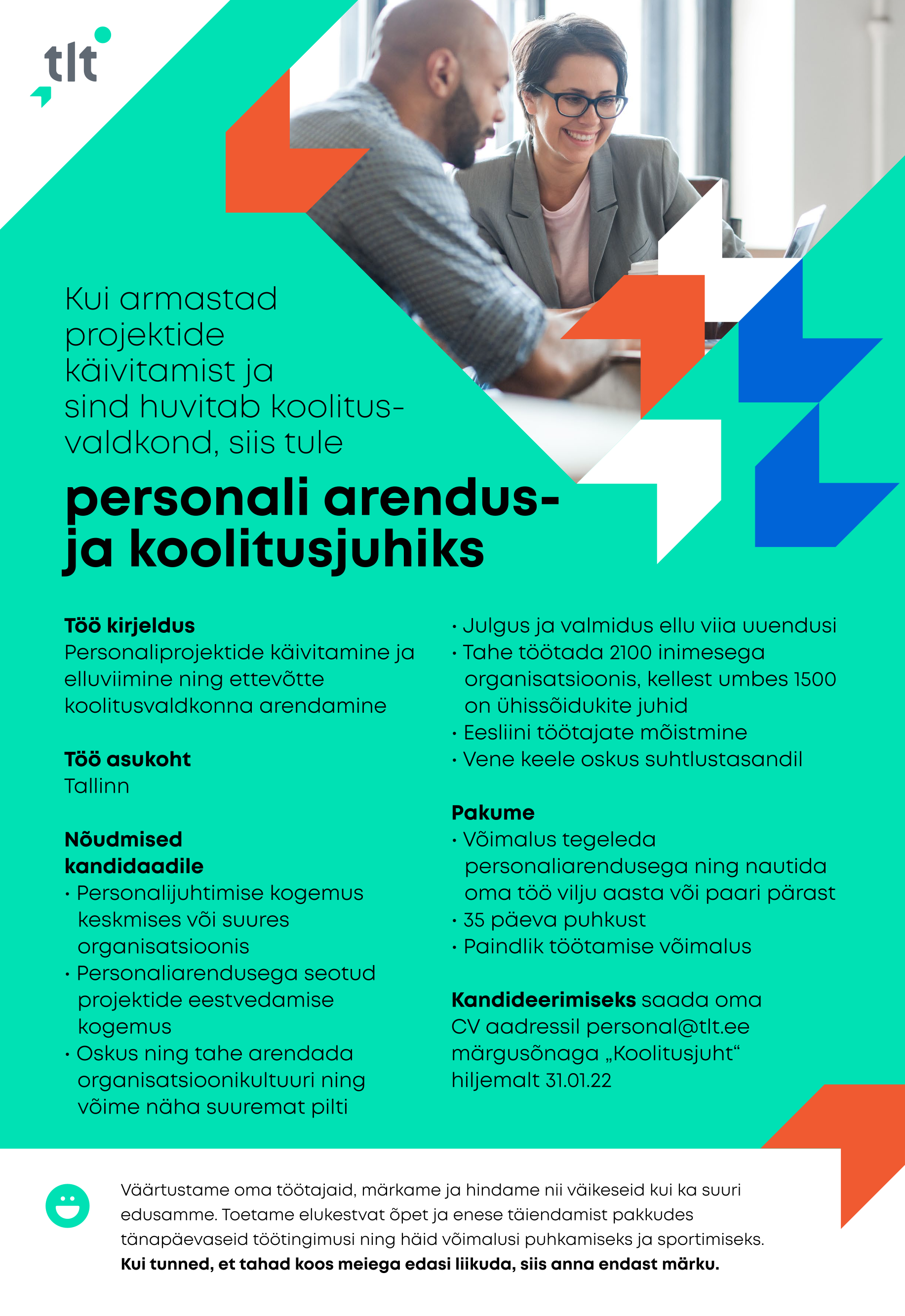 Tallinna Linnatransport otsib kahte ambitsioonikat inimest: PERSONALIARENDUS- JA KOOLITUSJUHTI ning VÄRBAMISSPETSIALISTI, kellega koos kõike plaanitut ellu viima asuda.